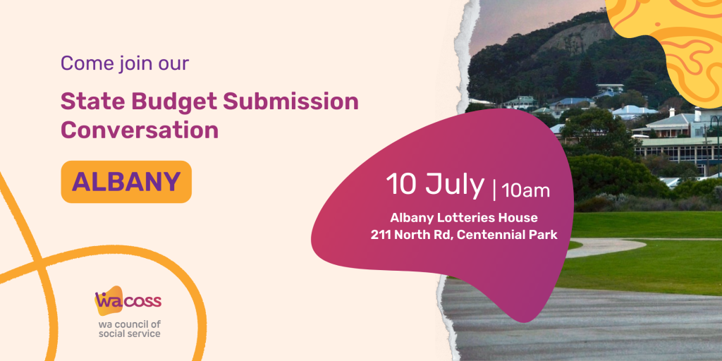 The Western Australian Council of Social Service invites you to our State Budget Submission community conversation. Each year WACOSS makes a Submission to the WA Government outlining priorities for public investment for people and communities who experience vulnerability and disadvantage, highlighting emerging issues, priorities of front­line community services and investment in community services.