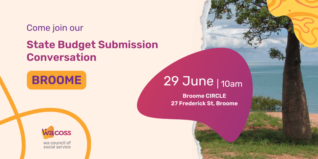 The Western Australian Council of Social Service invites you to our State Budget Submission community conversation. Each year WACOSS makes a Submission to the WA Government outlining priorities for public investment for people and communities who experience vulnerability and disadvantage, highlighting emerging issues, priorities of frontline community services and investment in community services.