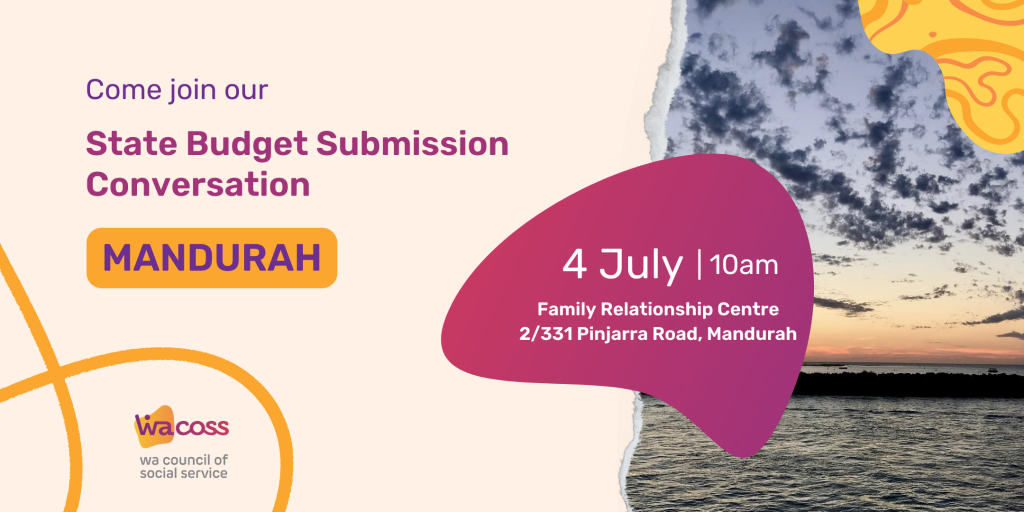 The Western Australian Council of Social Service invites you to our State Budget Submission community conversation. Each year WACOSS makes a Submission to the WA Government outlining priorities for public investment for people and communities who experience vulnerability and disadvantage, highlighting emerging issues, priorities of frontline community services and investment in community services.