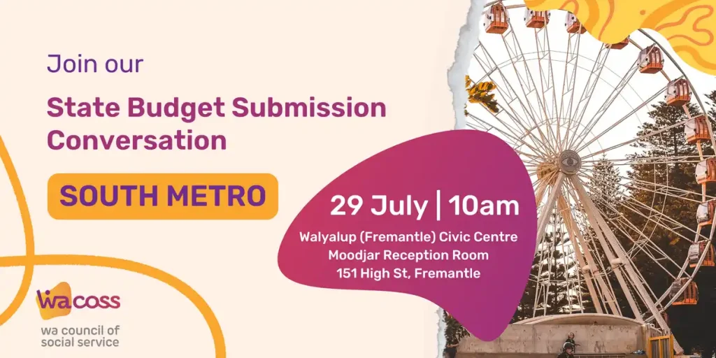 The Western Australian Council of Social Service (WACOSS) invites you to play a crucial role in our State Budget Submission Community Consultations. Each year, WACOSS delivers a comprehensive submission to the WA Government, recommending priorities for public investment to improve the lives of individuals and communities. The submission identifies emerging issues, underscores the critical needs of frontline community services, and the essential investment needed to build thriving communities.
