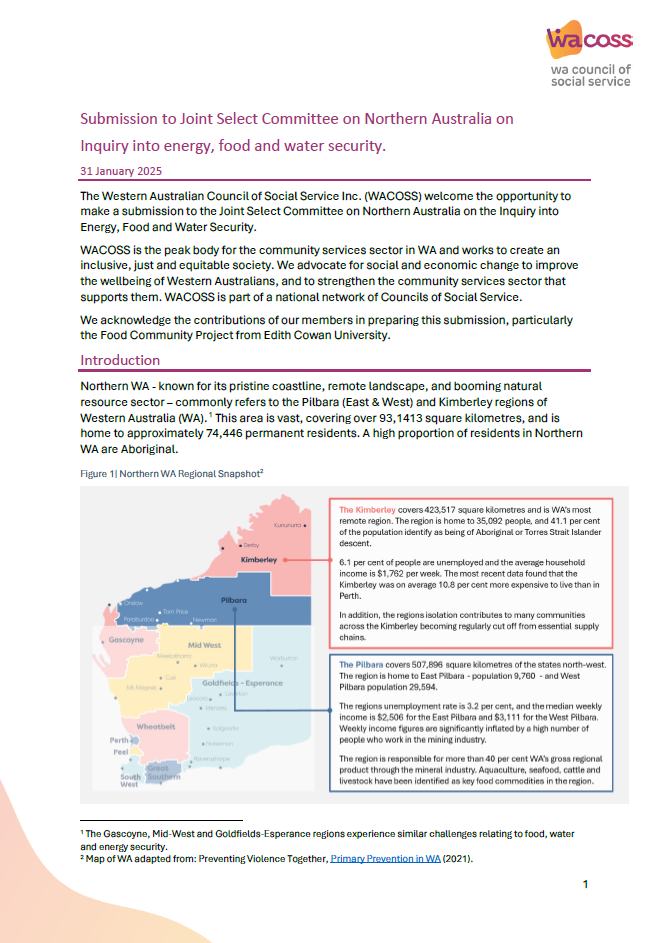 The Western Australian Council of Social Service Inc. (WACOSS) welcomes the opportunity to make a submission to the Joint Select Committee on Northern Australia on the Inquiry into Energy, Food and Water Security.