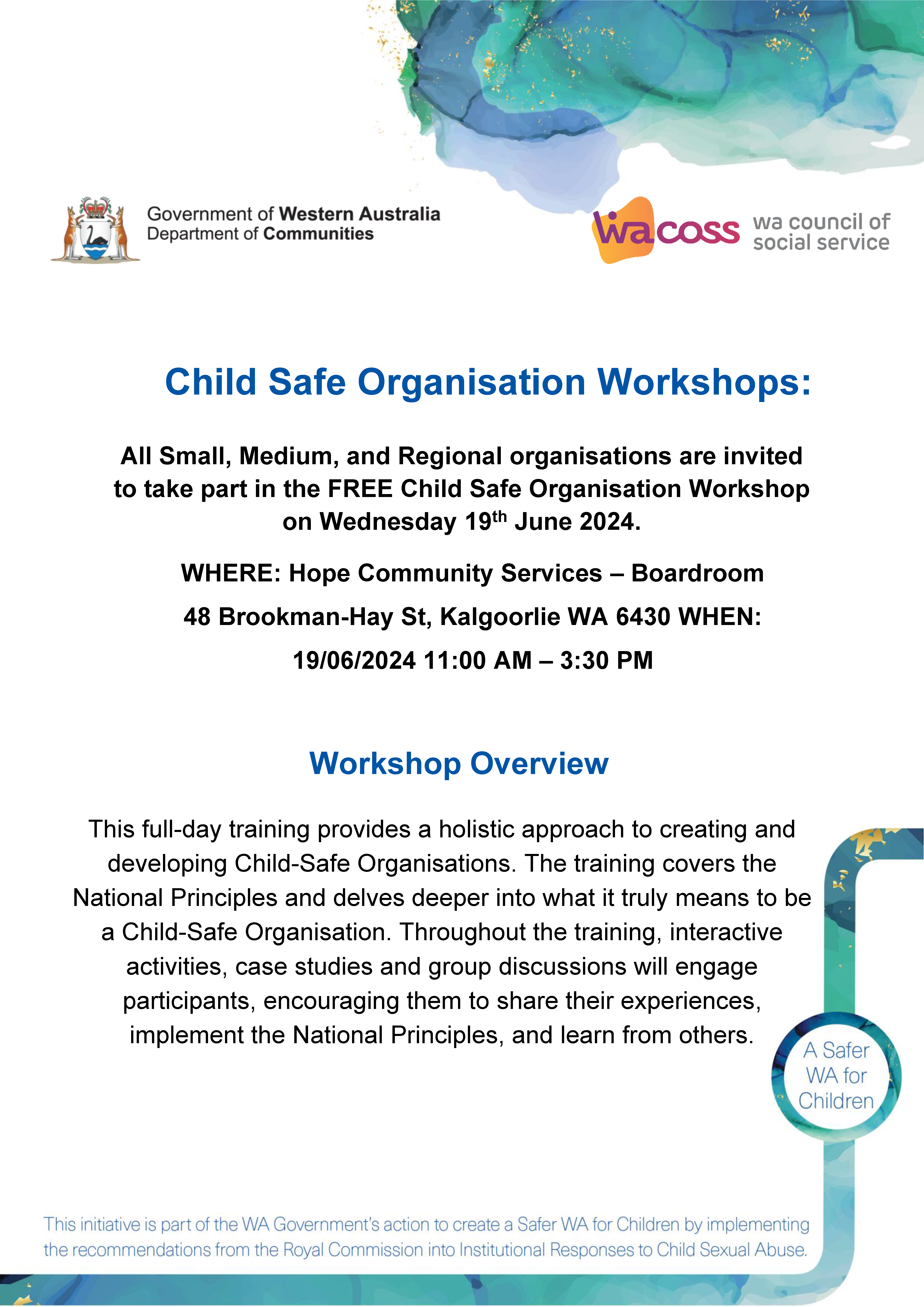 This full-day training provides a holistic approach to creating and developing child-safe organisations in the Kalgoorlie region.