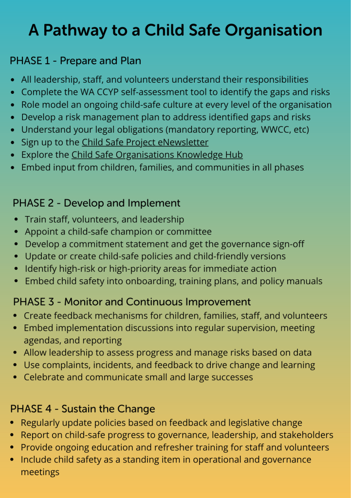 For further information, questions, or reaching out for advisory support – please email: childsafeproject@wacoss.org.au